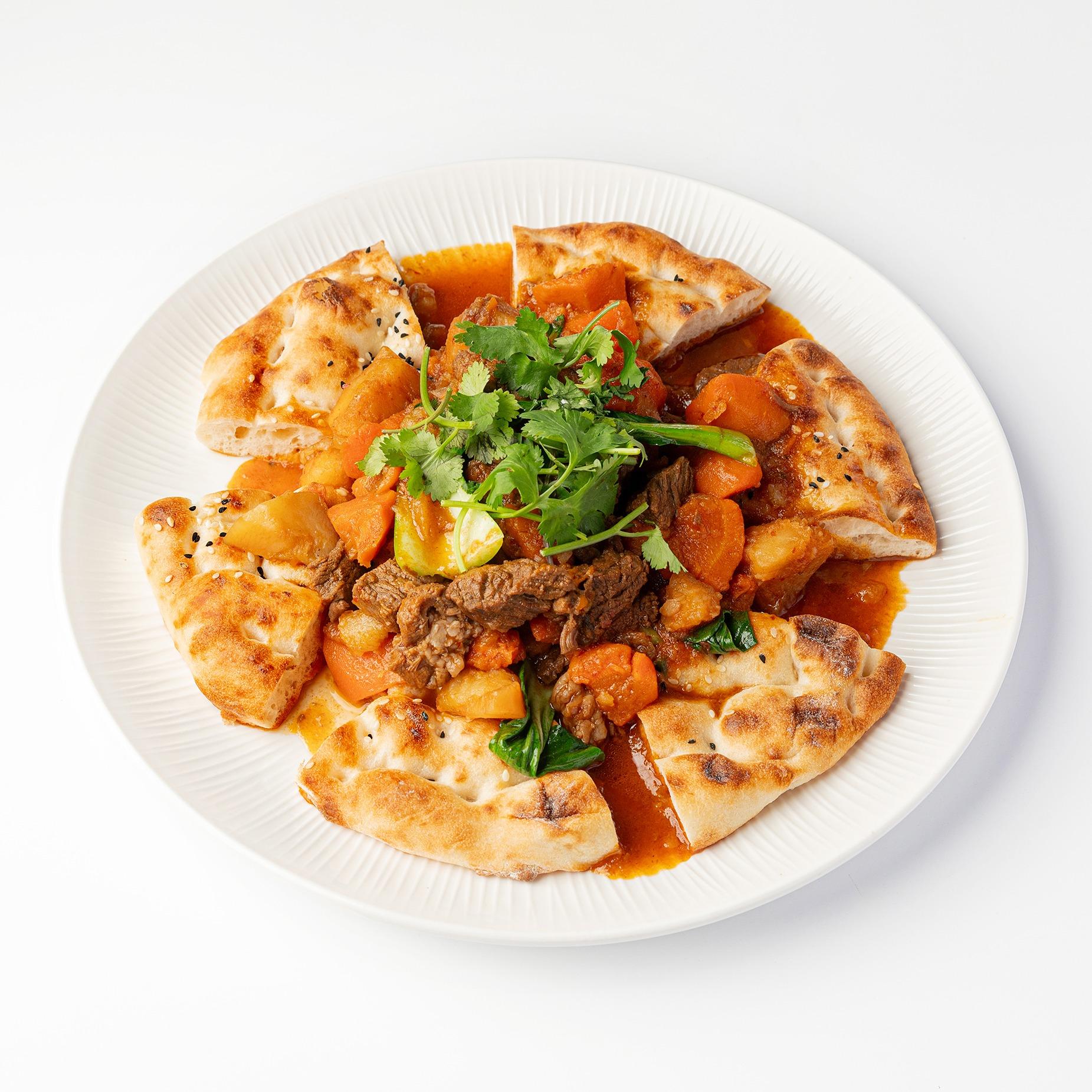 Beef, Onion, Carrot, Potato, Bok-choy and Naan.