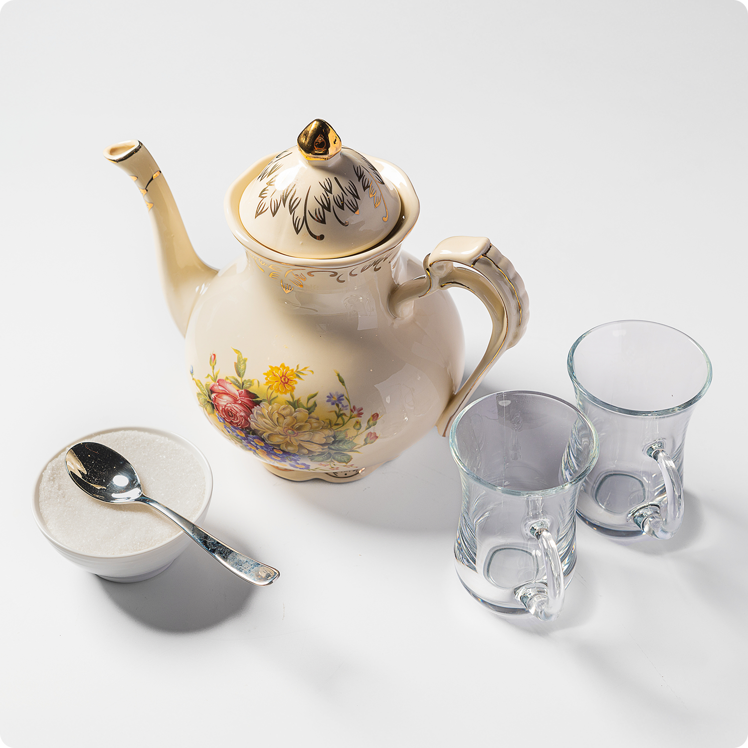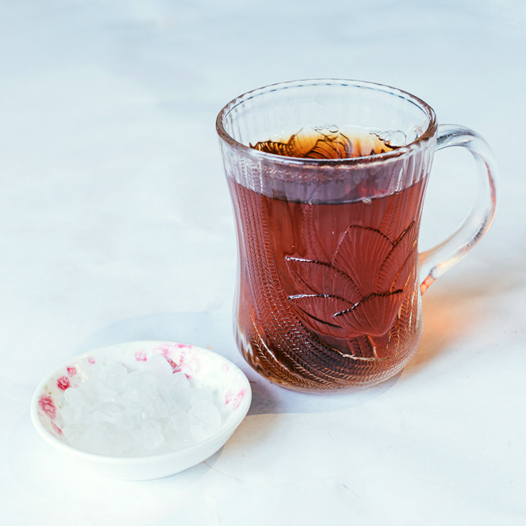 A pot of organic tea made of rose, red dates, wolf berry and side of crystal sugar. (*Dolan Chai is Caffeine Free)