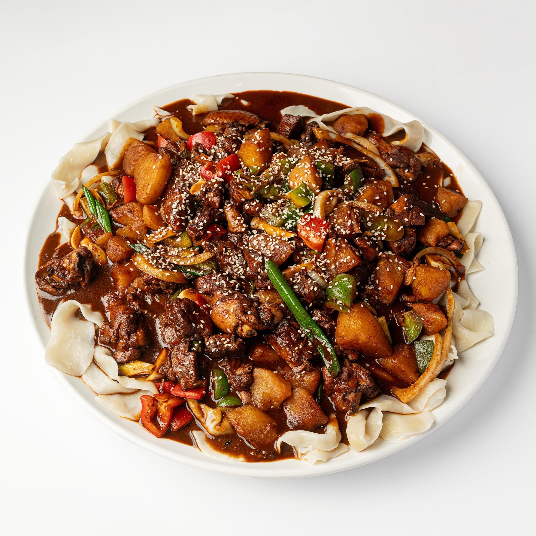 Large portions of marinated and sautéed, bone-in chicken with vegetables on a bed of hand-pulled flat noodles, and available with mild, spicy, or extra spicy seasonings. (Preparation time up to 25 minutes)