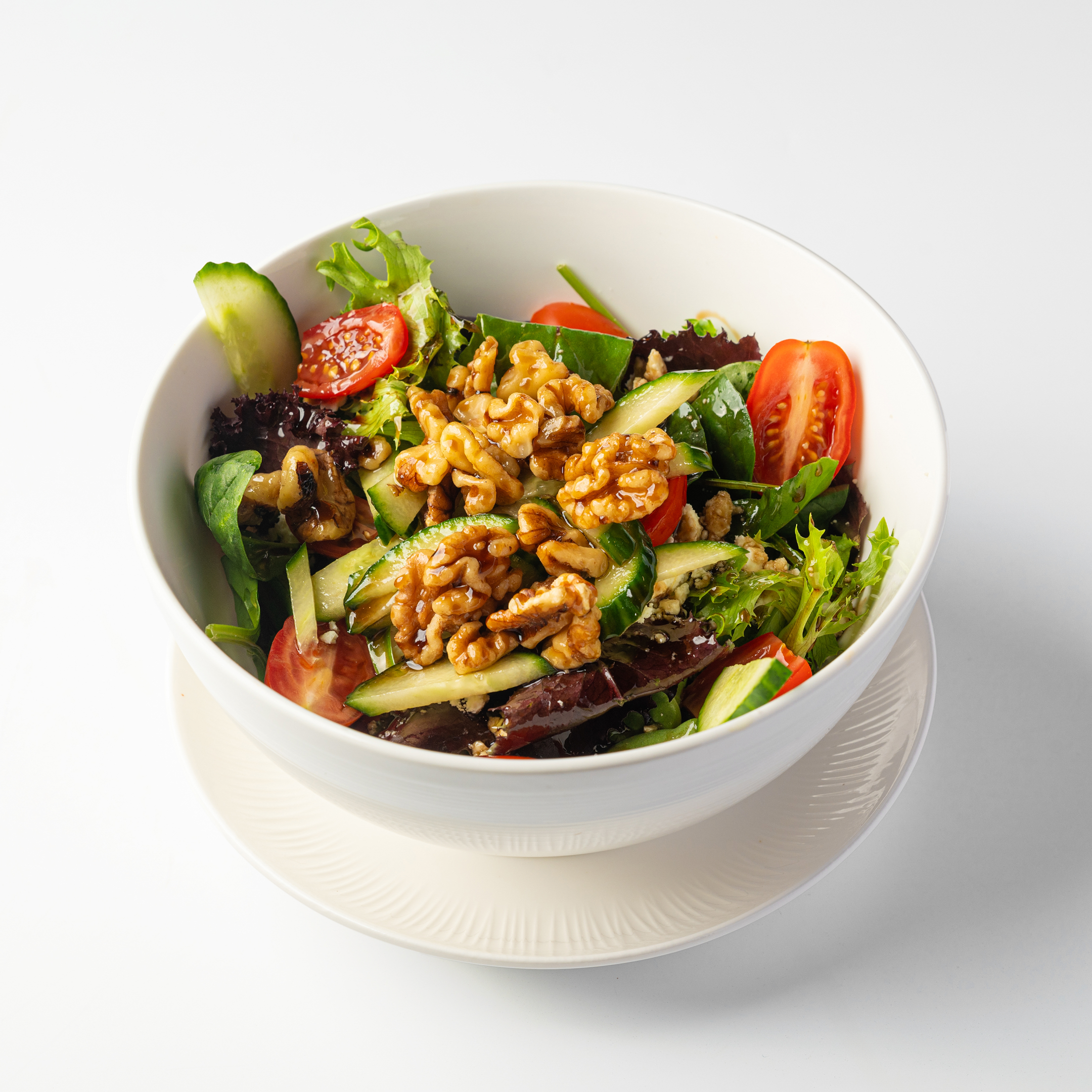 Mixed greens, tomato ,cucumber, onion and walnuts with pomegranate sauce.