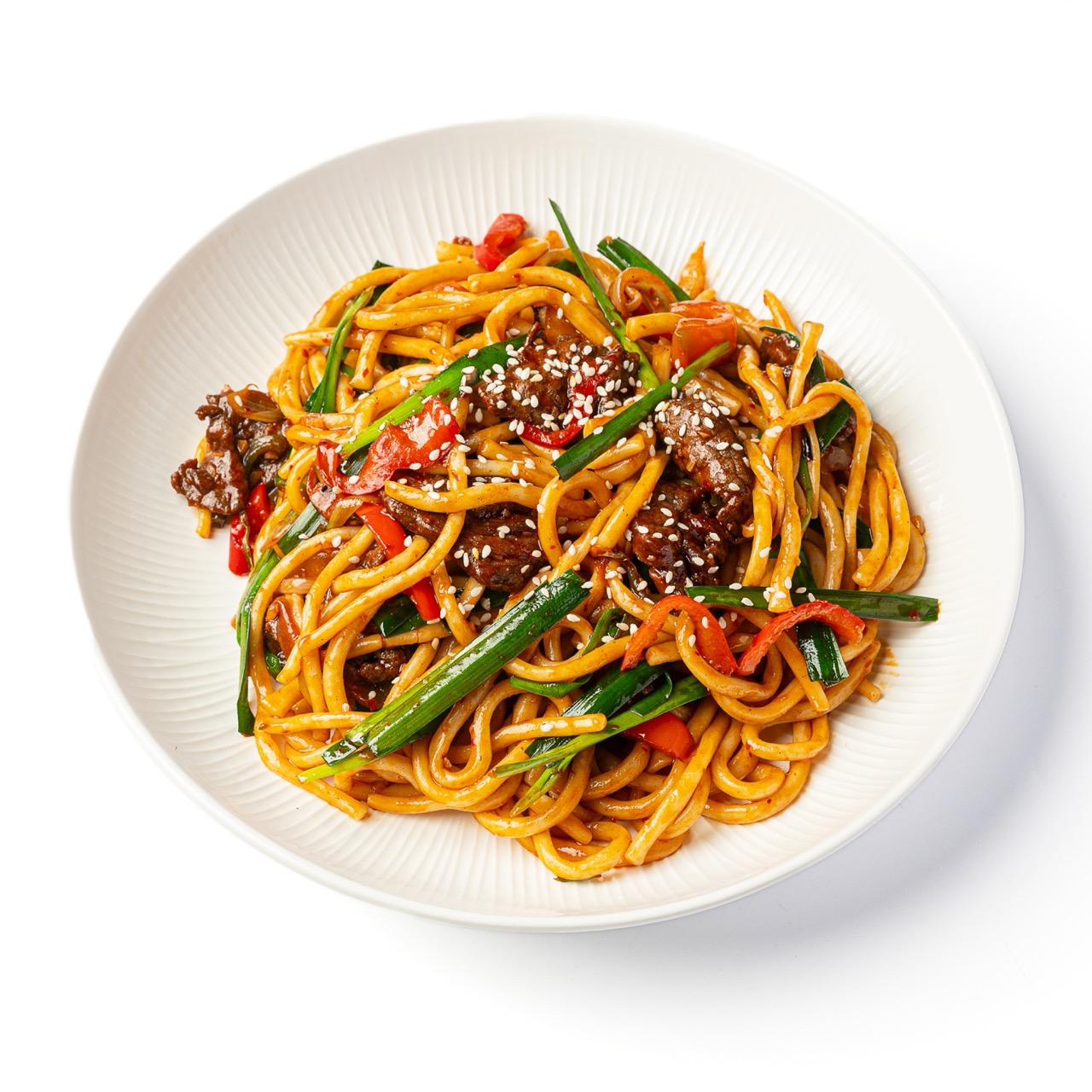 Beef, stir-fried onions, cabbage, mushrooms, green and red peppers, oyster-flavored sauce, and tomato topped hand-pulled chewy noodles.