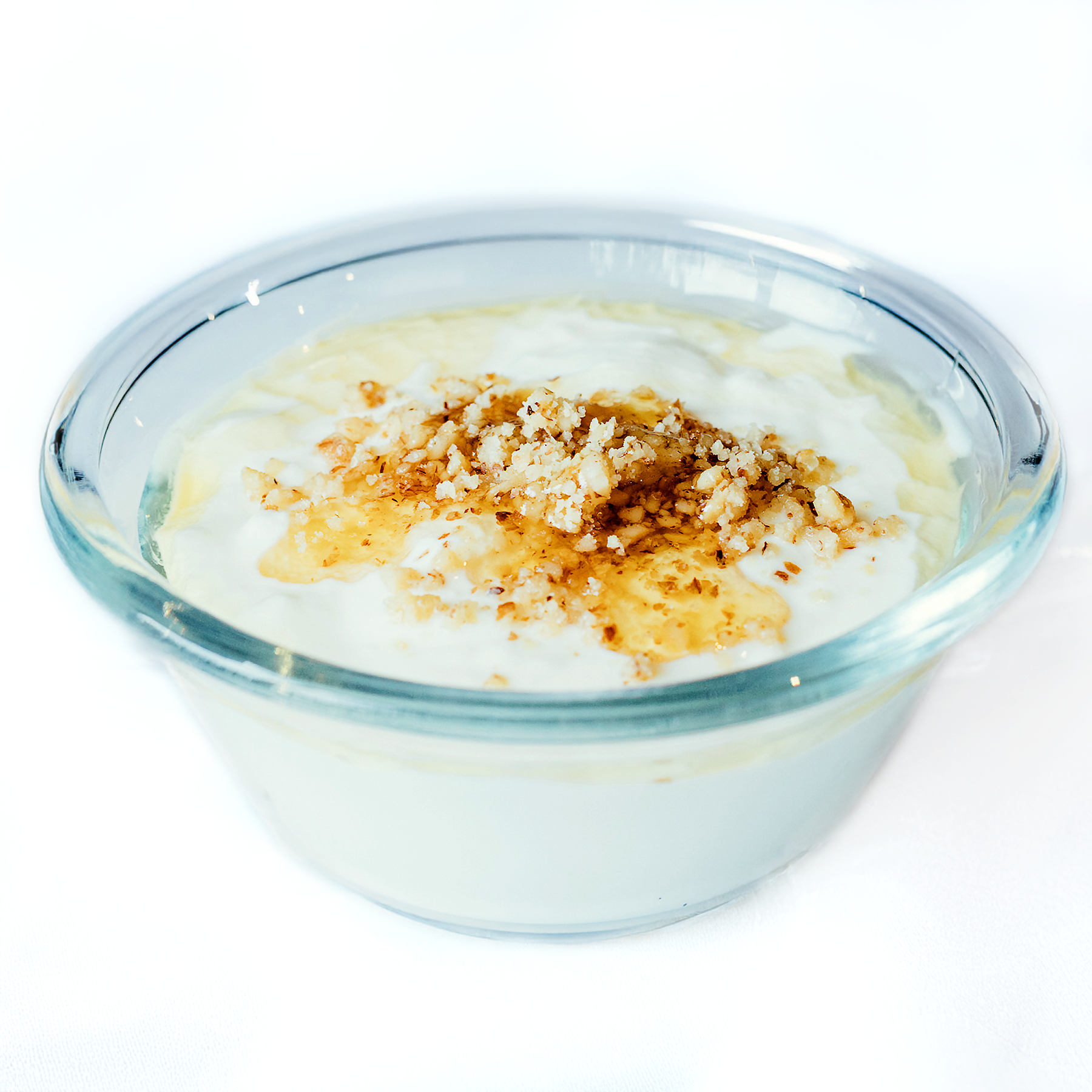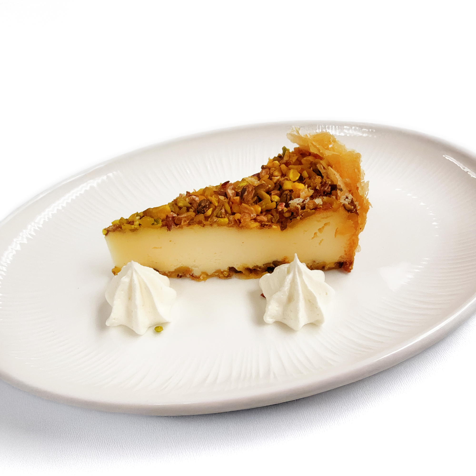 Creamy cheesecake on a buttery phyllo or graham crust, topped with honey-soaked pistachios and walnuts, and a touch of cinnamon