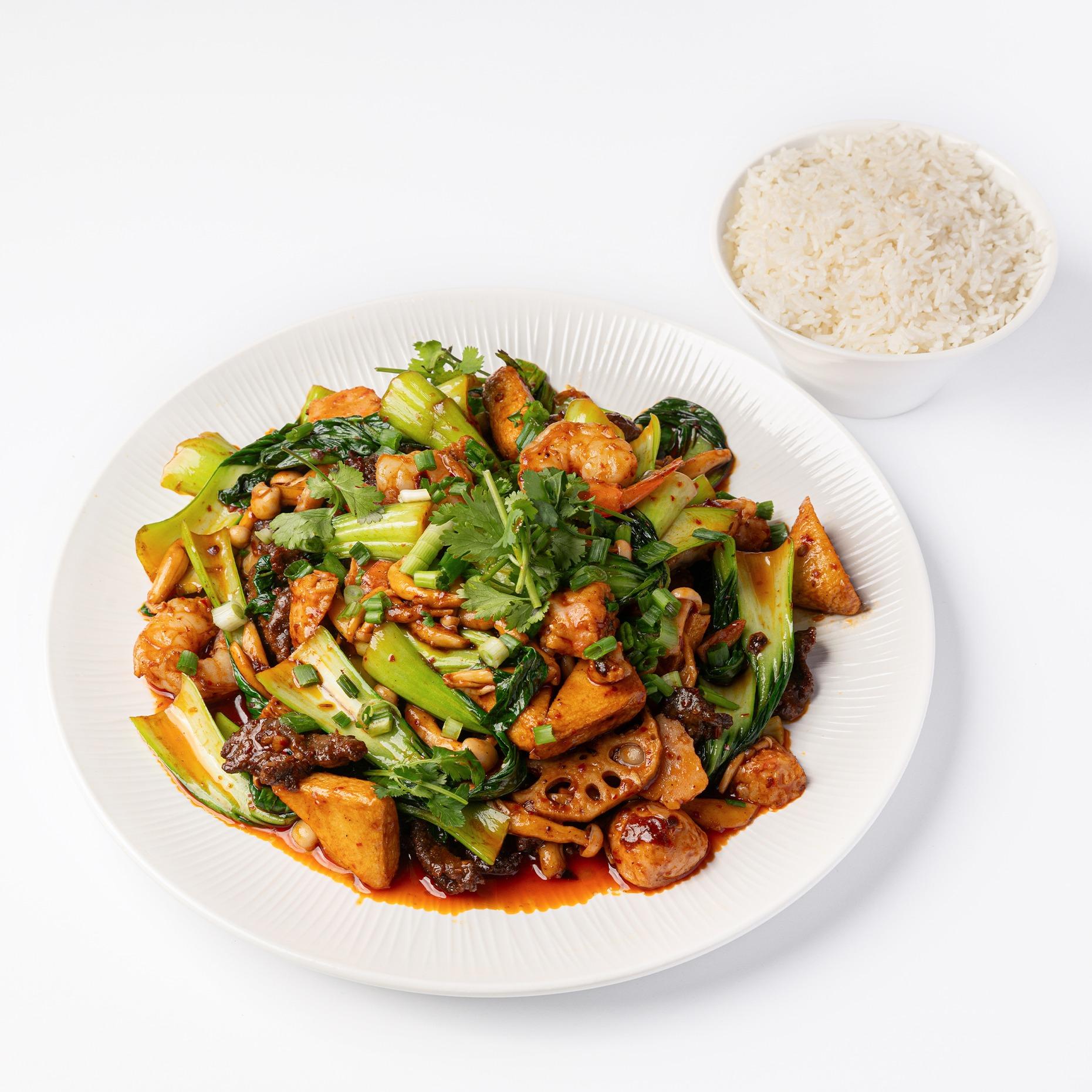 Beef, Shrimp, Fishball, Shrimp Ball, Fish Tofu, Squid, Gluten, and Bok Choy served with Spicy Garlic Sauce and two servings of White Rice.