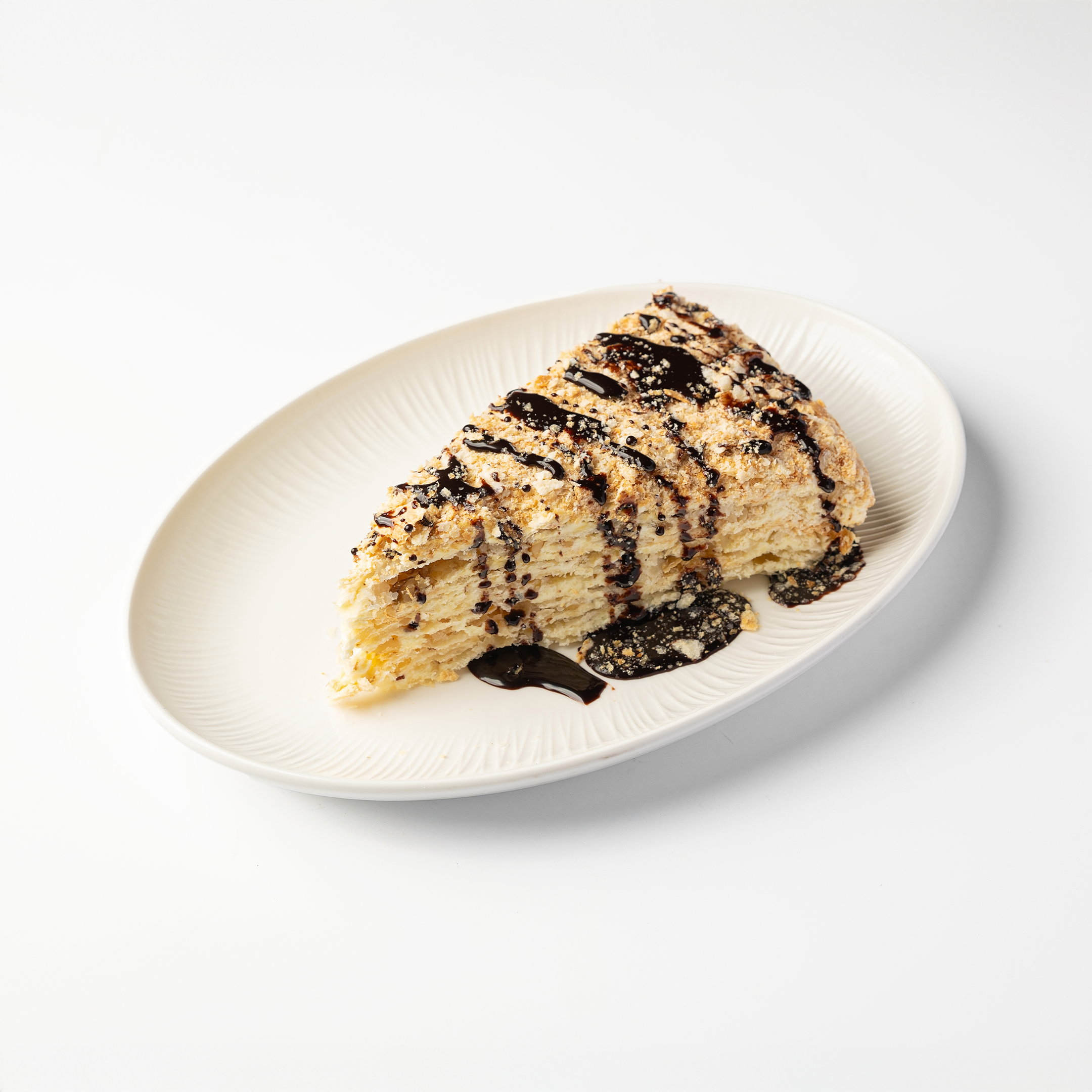 Crafted with white flour, eggs, honey, walnuts, sour cream, buttery cream, and a touch of lemon.